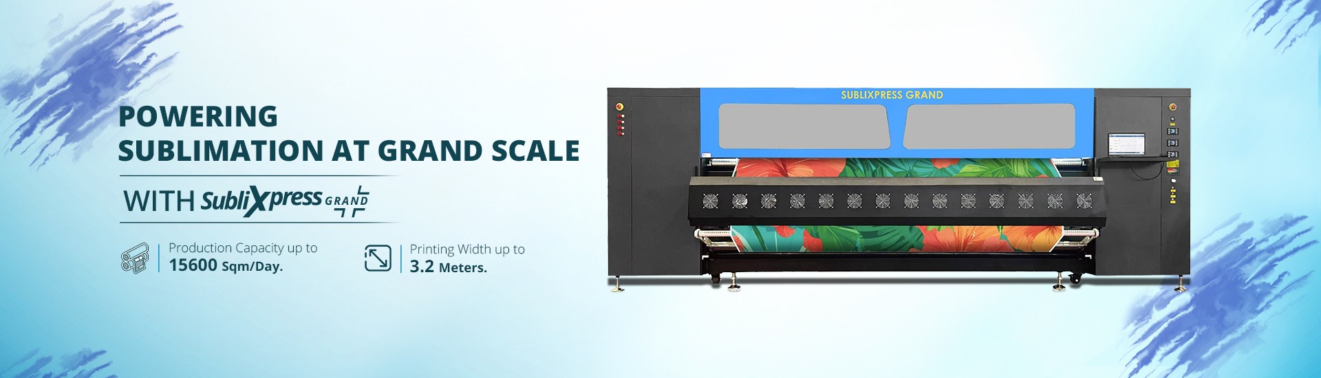 SUBLIXPRESS GRAND”, the new 3.2-meter wide dye-sublimation printer engineered for high-volume production. Designed for industrial print environments, it delivers fast throughput, consistent color performance, and enhanced reliability for long-run jobs with heavy rolls. The system supports bulk ink delivery and jumbo media feeding for uninterrupted production, making it ideal for export-grade sublimation textile markets.
